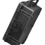 wasser- und staubdichter Koffer in schwarz, leer, mit zwei stabillen Doppel- Leichtlaufrollen und ausklappbarem Trolleygriff.
