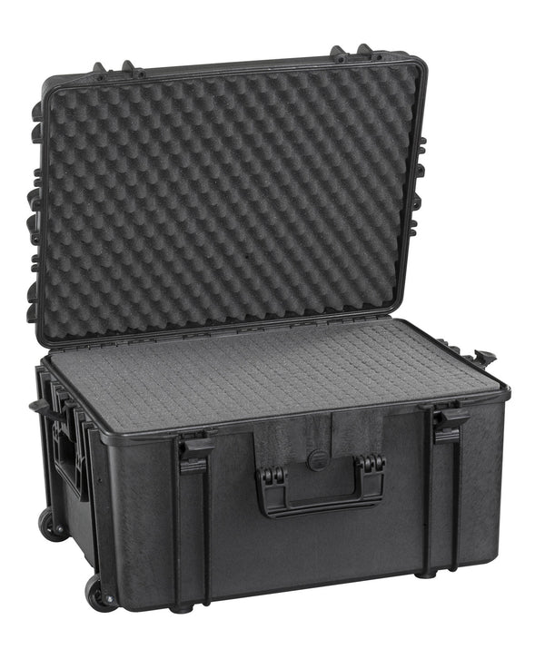 wasser- und staubdichter Koffer in schwarz,inkl. Schaumstoffeinlagen mit Würfelstanzung zur individuellen Anpassung, 2 stabilen Leichtlaufrollen Innenmaß: 620 x 460 x 340mm Aussenmaß: 687 x 528 x 366mm wasser- und staubdichter...